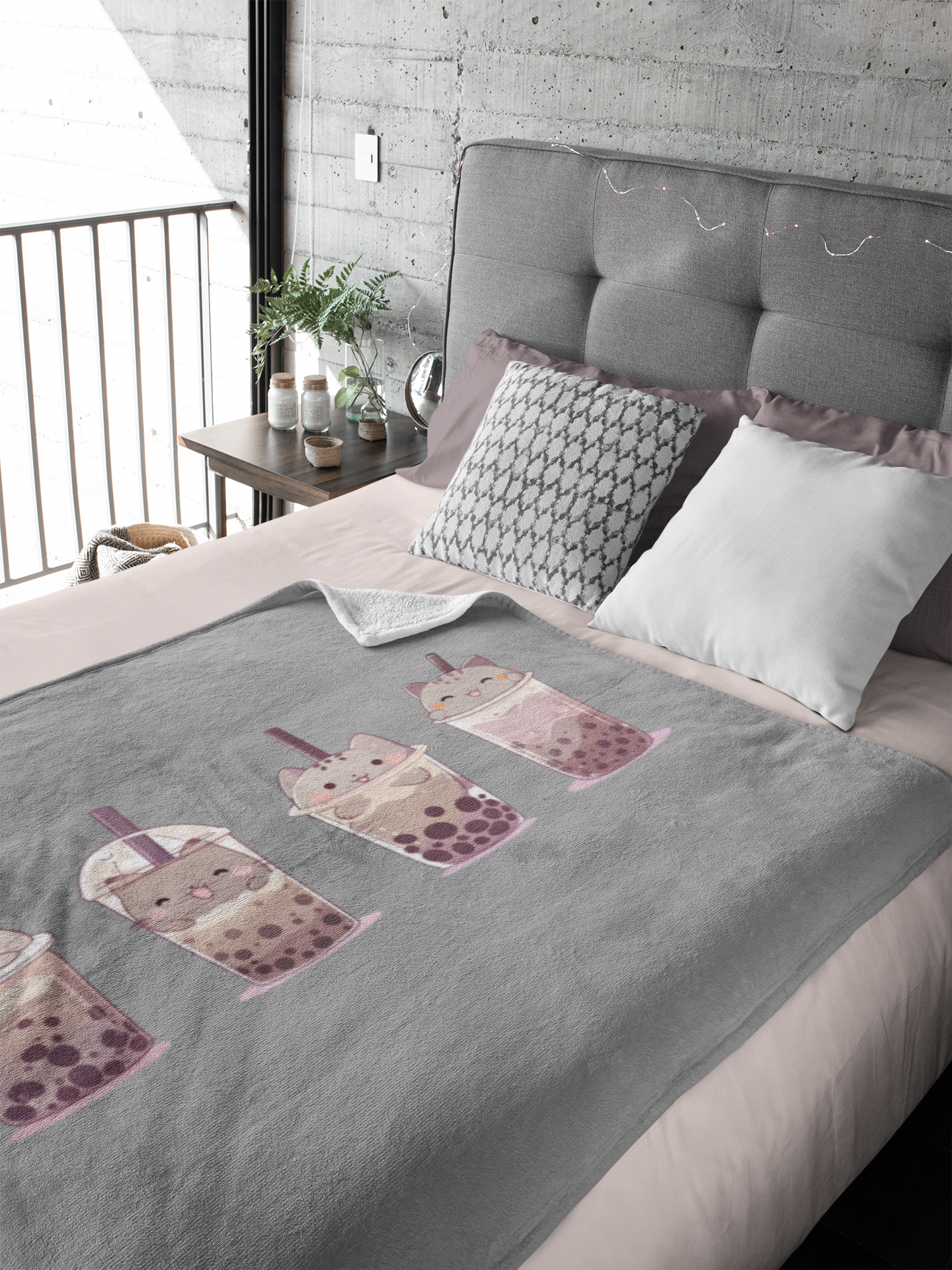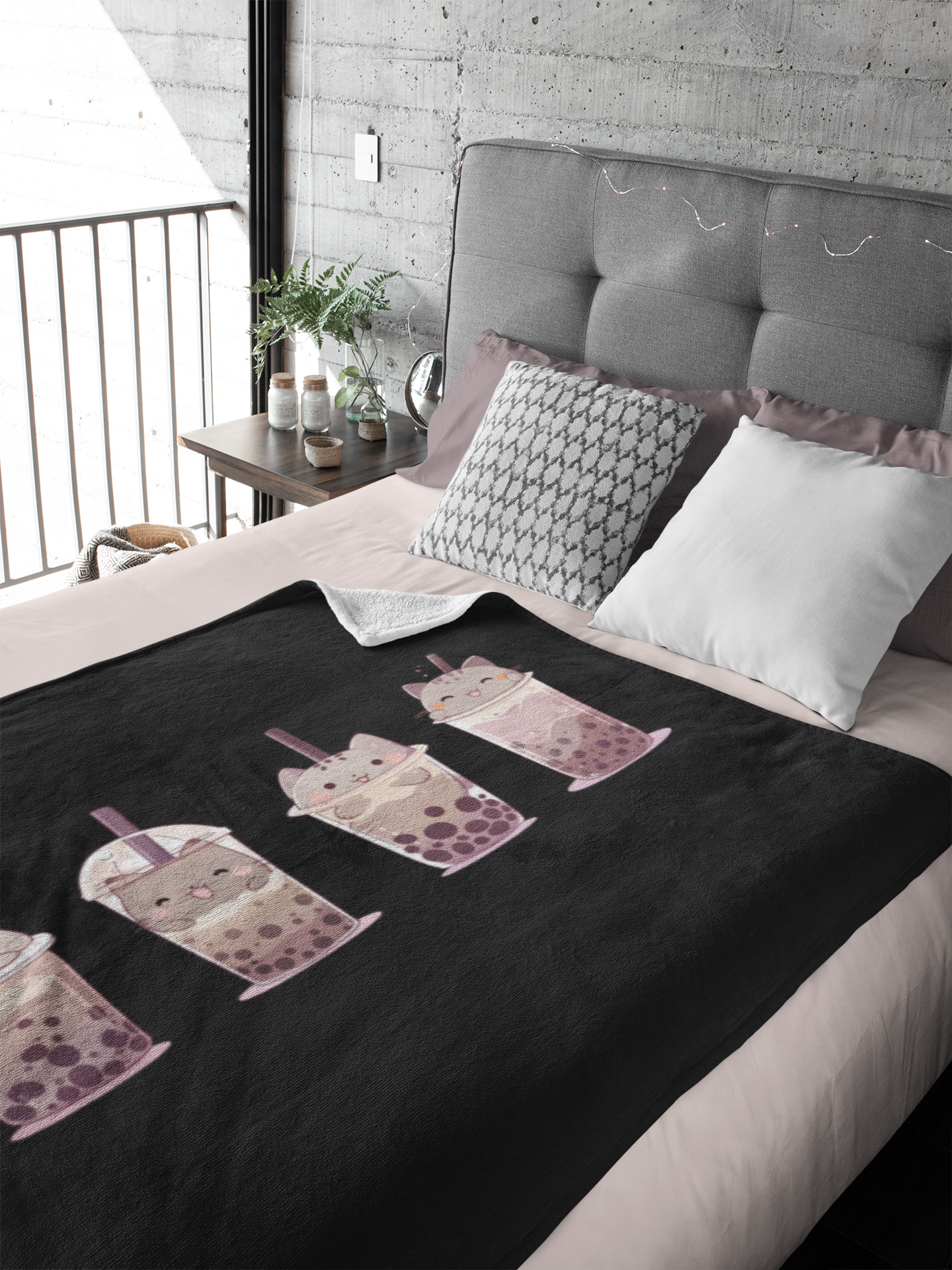Soft, warm, and ultra-cozy, this blanket is perfect for couch lounging, movie nights, study sessions, or relaxing with your favorite drink. A fun and charming choice for boba lovers, cat fans, and anyone who enjoys cute, feel-good vibes.