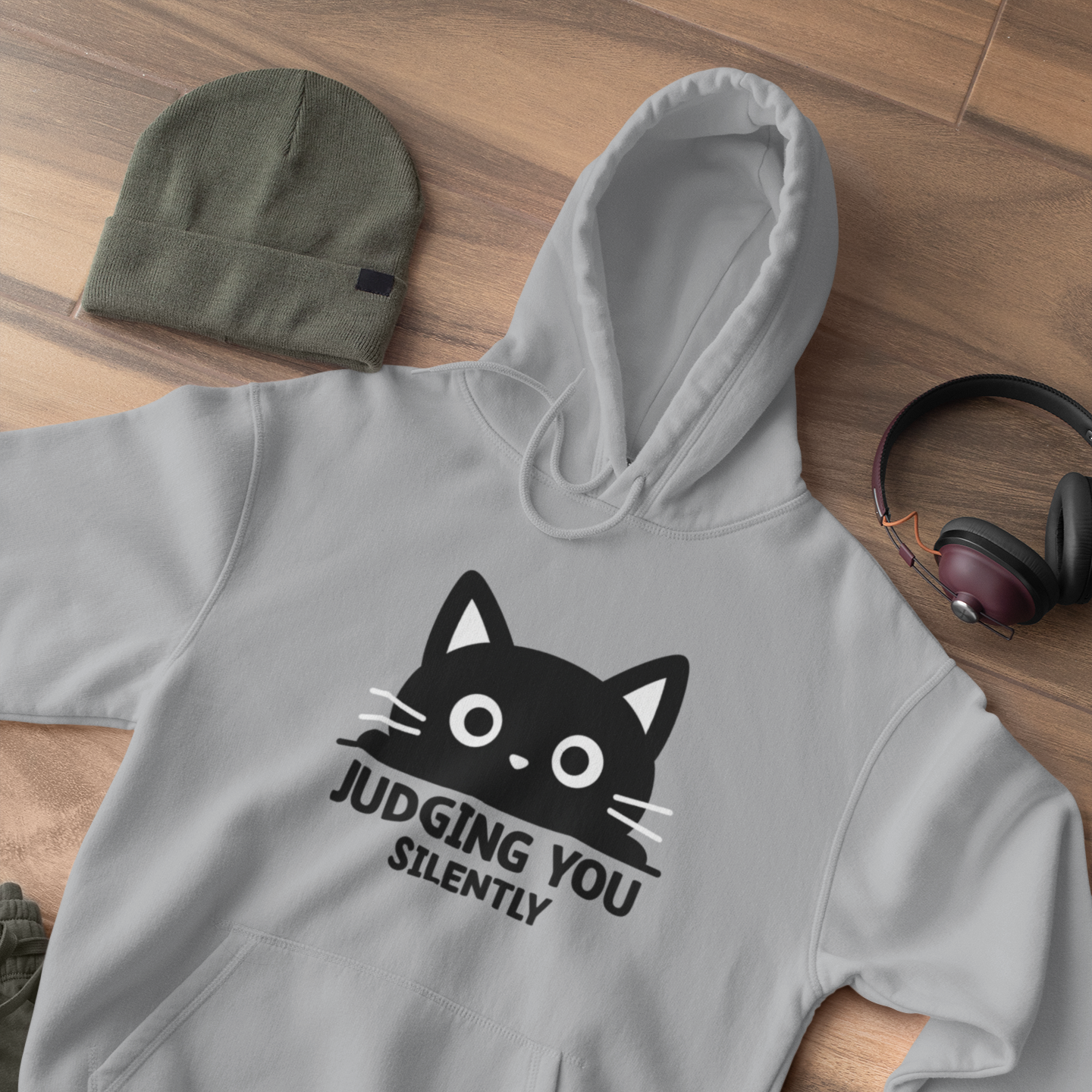 This hoodie features our signature black cat doing what cats do best — silently observing and mentally scoring your every move.
