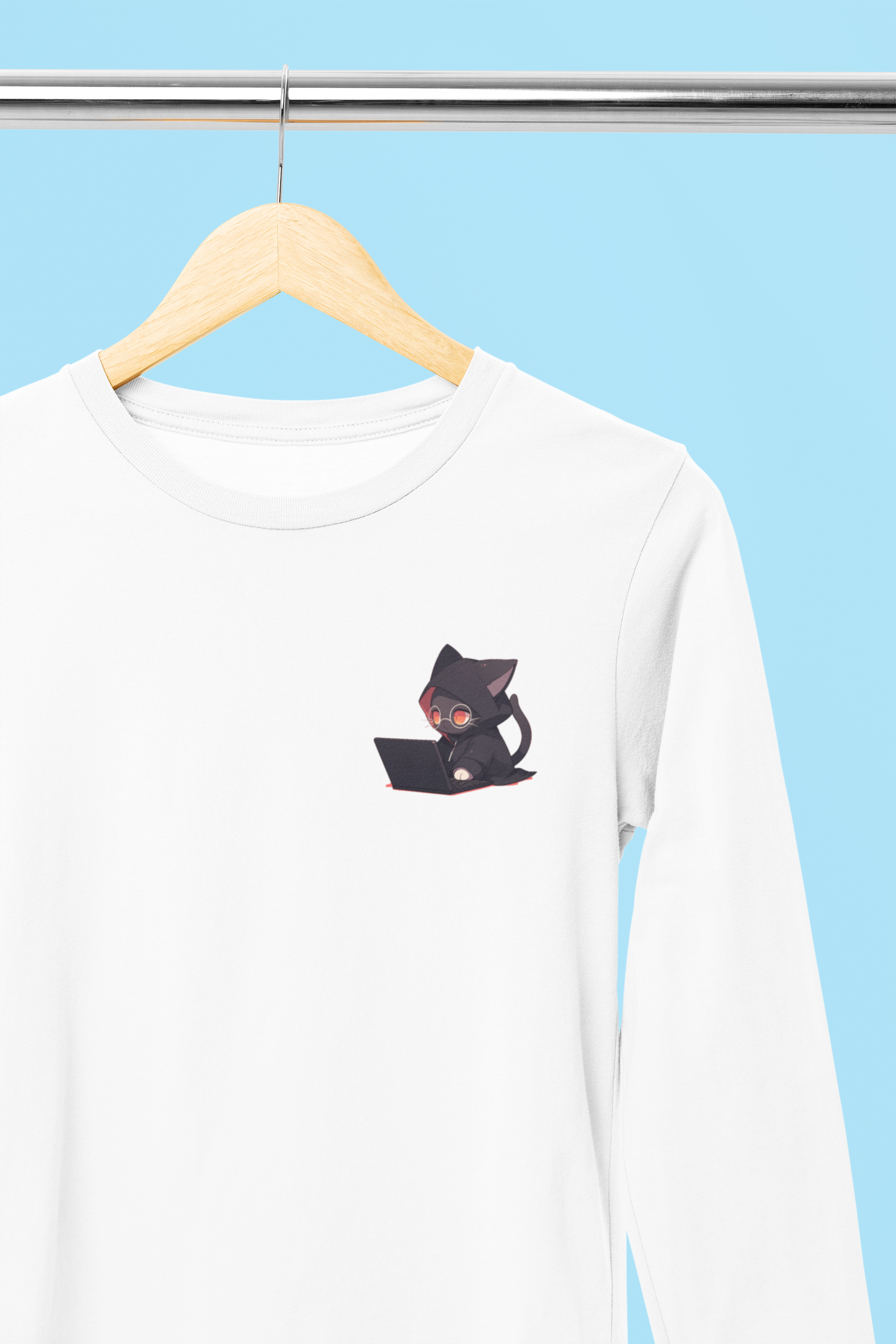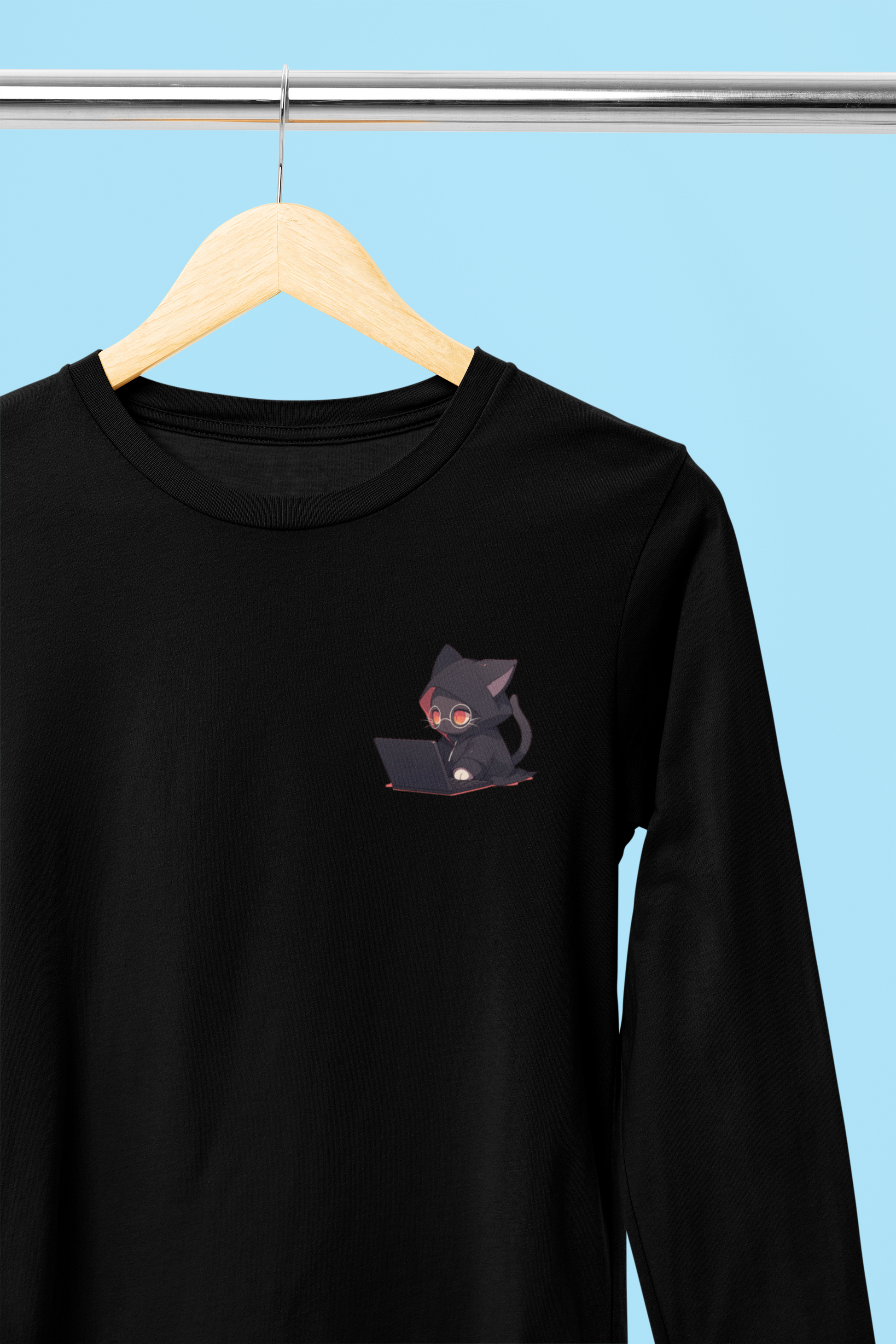 The “Midnight Debugger” long sleeve tee features a focused black cat in a hoodie, mid-debug session, channeling all the calm intensity of a true night coder. It’s the perfect blend of cozy and cool for cat lovers who prefer their bugs fixed before sunrise.