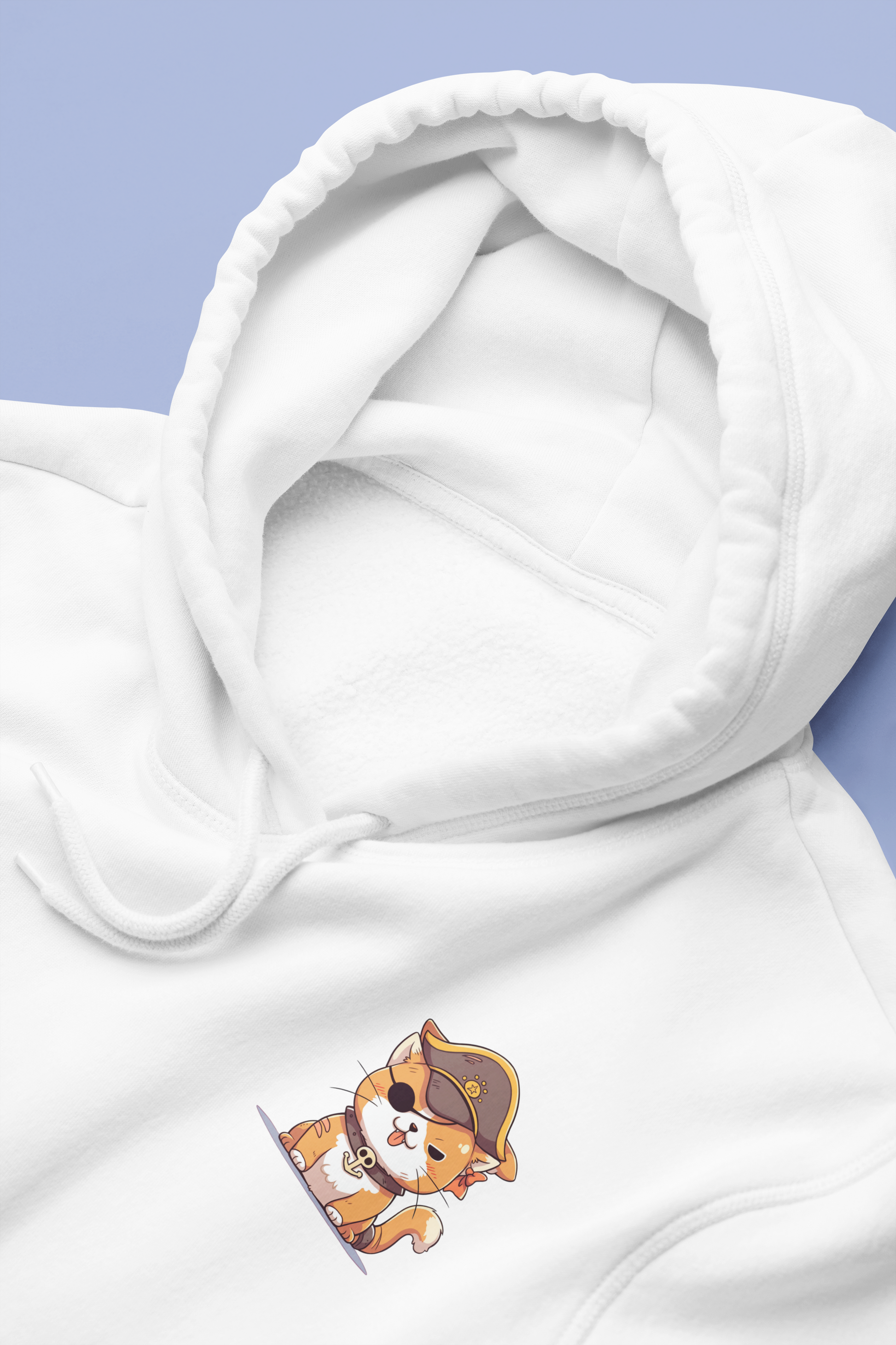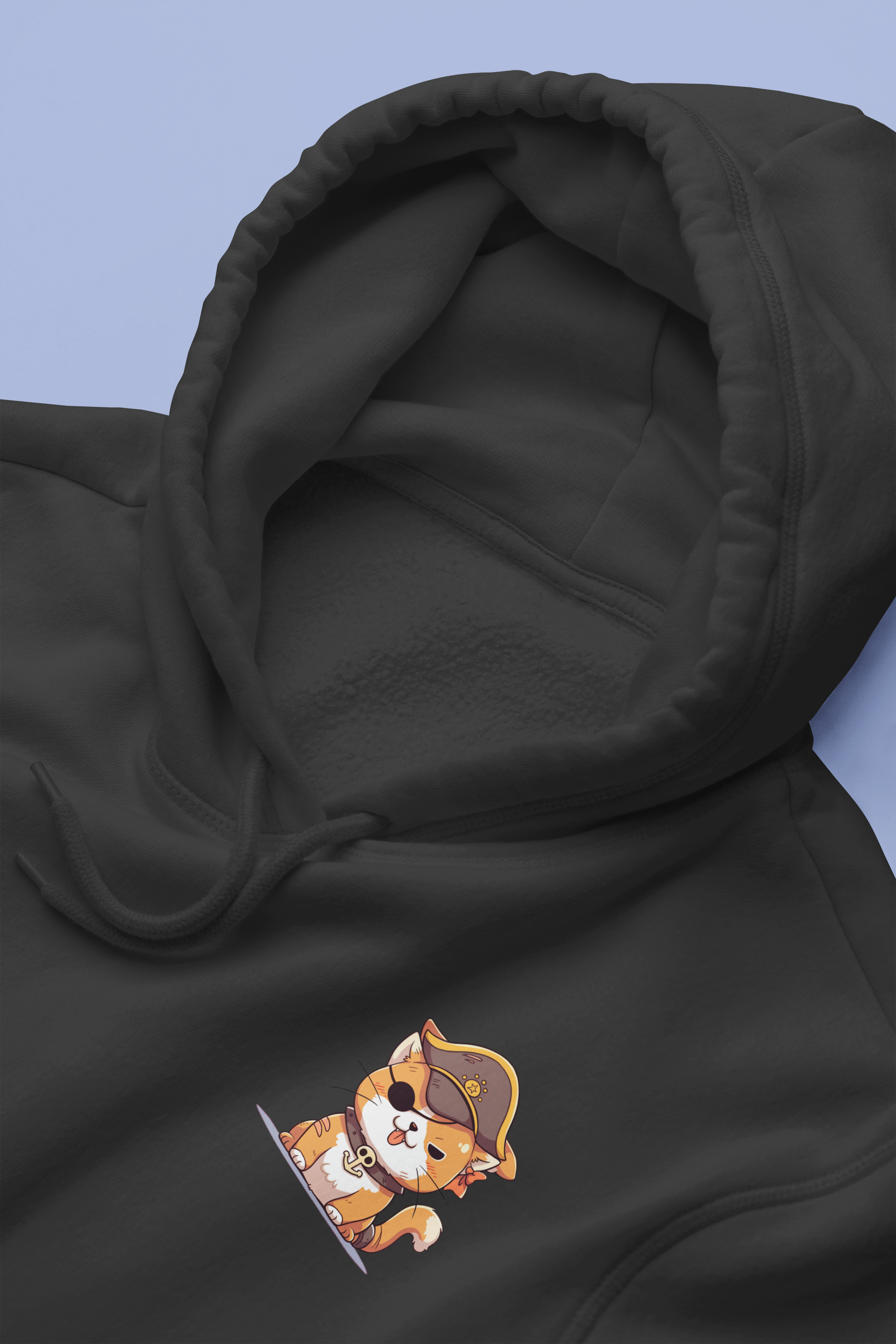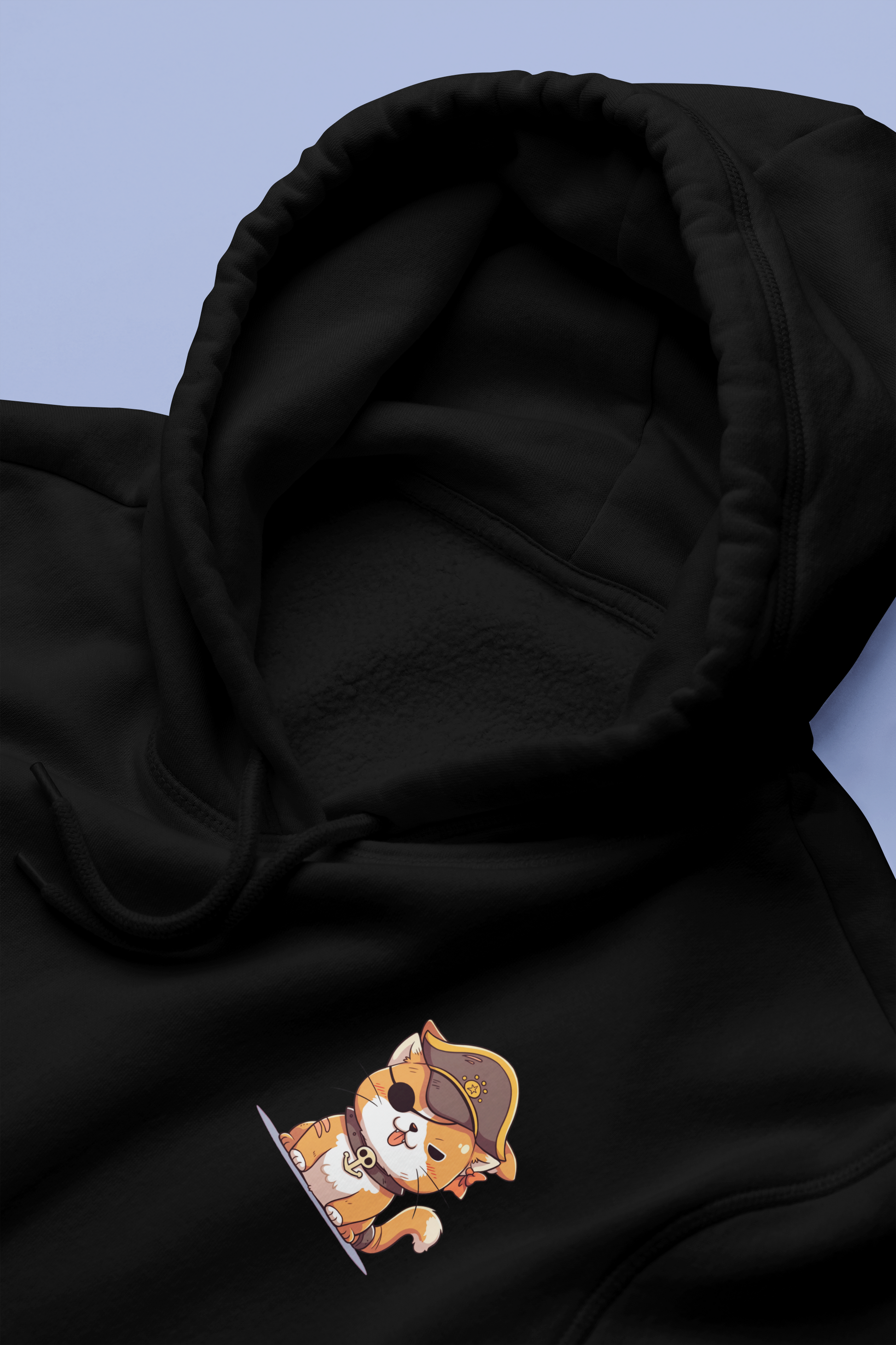 Introducing our "Tabby Buccaneer Hoodie" featuring a cute orange tabby cat aspiring to be the king of pirates! This pullover hoodie is purrfect for cat lovers who enjoy a touch of pirate charm in their wardrobe. It's not just a hoodie; it's an awesome gift choice for those who adore cats and love playful adventures – making it a fantastic option for Gifts for Cat Lovers!
