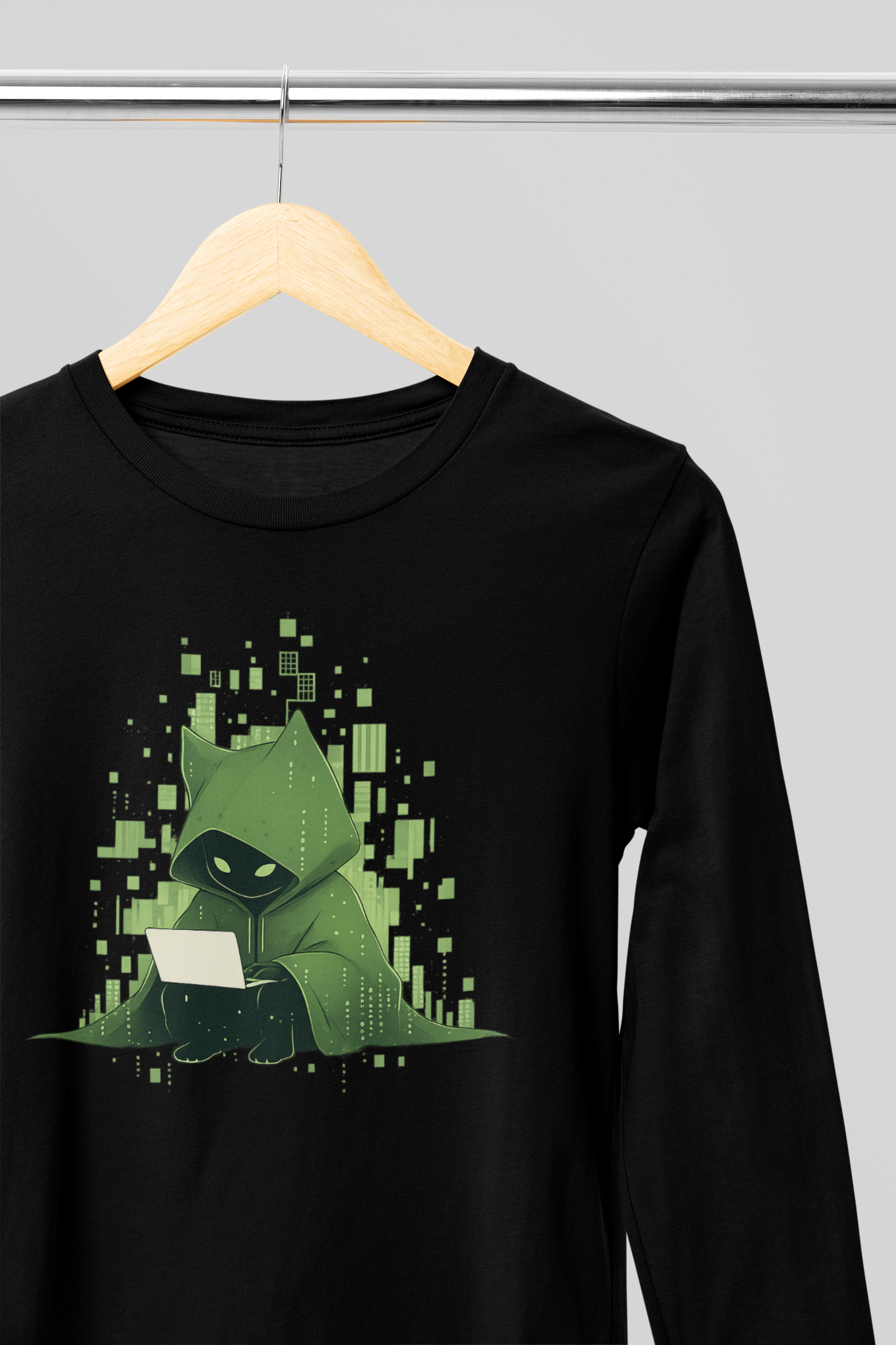 The "The Meowtrix" Long Sleeve Tee delivers all-day comfort with a sharp digital edge. Showcasing a mysterious cat in a hacker’s cloak, it’s the perfect layer for gamers, coders, or anyone who prefers stealth mode.